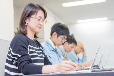普段、今までの経験から当たり前のように出来ている事を、いざテキストで文字として目にすると新鮮に映るようで、先生役の社員から質問が飛ぶと、首を捻りながら答える場面もありました。どの顔も真剣です!